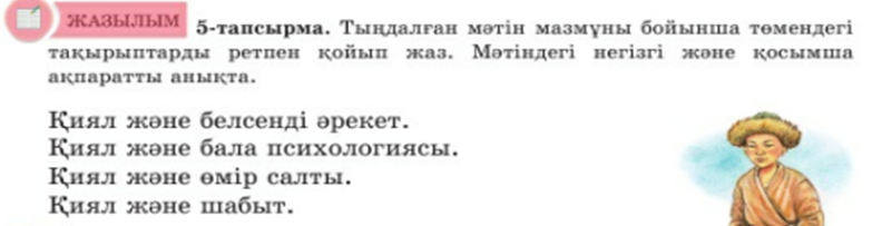 Мәтінді тыңдайды; Тыңдалым мәтінінің негізінде жай сұрақтар құрастырады; Нақтылау сұрақтарын құрастырады; Тәжірибе сұрақтарын құрастырады; Тыңдалған мәтін мазмұны негізінде тақырыптарды реттілікпен орналастырады.