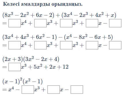 10.2.1.5. Көбейткіштерге жіктеу әдісі арқылы бір айнымалысы бар көпмүшенің түбірлерін табу; 10.2.1.10. Көпмүше түбірлерін табу үшін Горнер схемасын қолдану; 10.2.1.12. Жоғары дәрежелі теңдеулерді шешуде жаңа айнымалы енгізу әдісін қолдану. |