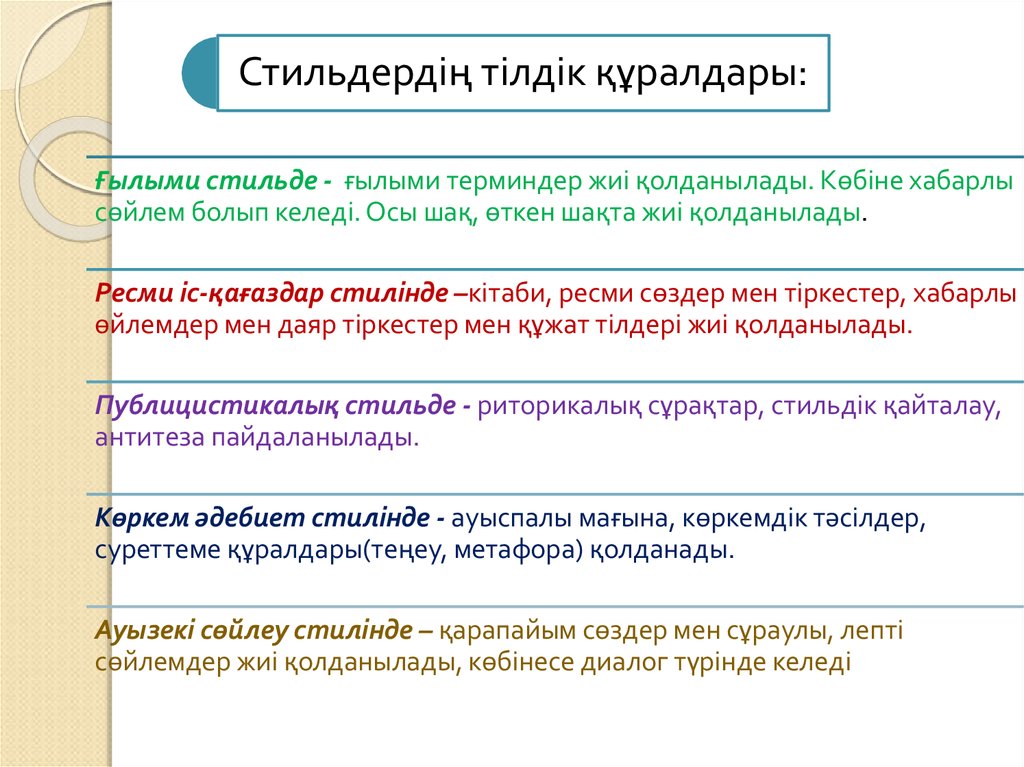 Тыңдалым мәтінінің стилін, стильдің тілдік құралдарын анықтайды.