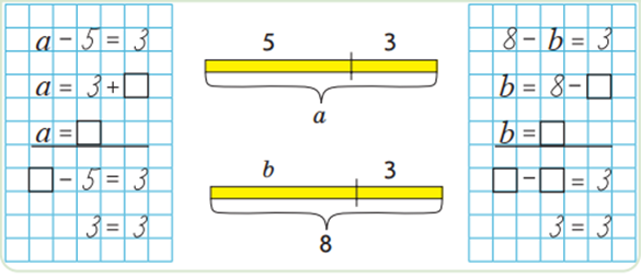 1.2.2.2 таңдап алу әдісі және қосу мен азайту амалдарының байланысы негізінде теңдеулерді шешу. |