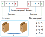 1.2.1.3 қосу мен азайту арасындағы қатынасты әріпті өрнектер түрінде: а + b = c, c – a = b, c – b = a көрсету және қолдану; |