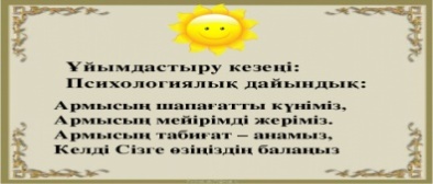 Ұйымдастыру кезеңі: Мұғалім оқушыларды шаттық шеңберіне тұрғызады. Ынтымақтастық атмосферасын орнату үшін парталас достарымен қазақша амандасады |