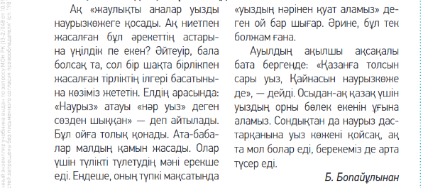 Қай шумақ мәтінге сәйкес келетінін айтады. Мәтіндегі көркемдеуіш сөздерді теріп жазады. Олардың автордың ойын берудегі рөлін айтады. «Уыз айы мен Наурыздың байланысы» тақырыбында өлең мазмұны бойынша диалог құрайды. Мейрам атауына қатысты өз пікірлеріңді полилог түрінде бөліседі. Мәтінді оқиды. Түсінгеніңді айтады. |