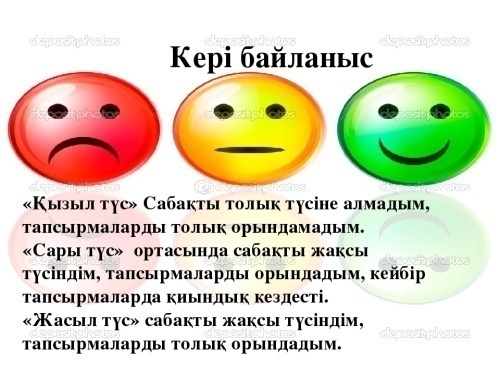 Бүгінгі сабақты қаншалықты меңгергендігі, қанадй қиындықтар кездескендігі, тапсырмаларды қалай орындағаны жайында рефлексия жасайды. |