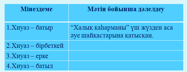 «Іріктеп оқу» стратегиясы Оқылым 8-тапсырма. Мәтінді мұқият оқыңдар. «Сұрақ-жауап» әдісі А Мәтін мазмұны бойынша сұрақтарға жауап беріңдер. 1.Хиуаздың “қанатты қыз” атану себебі неде? 2.Хиуаз өскен өлкені қалай суреттер едіңдер? 3.Хиауаздың батылдығын қандай әрекетінен байқауға болады? Мінездеме үлгісімен таныстырып, жазылу ретін түсіндіремін. Ә Мәтін мазмұнына сүйеніп, кестеге сәйкес Хиуазға мінездеме жазыңдар.