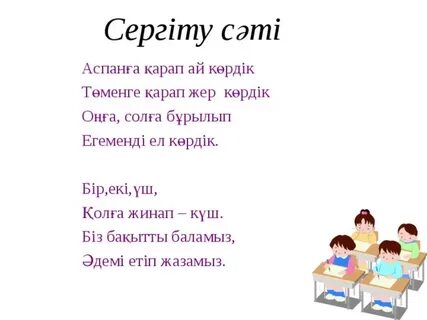 Мақсаты: Бір-біріне құрмет сезімін ояту Амандасады Үй тапсырмасын тексертеді Тапсырмалар ды орындайды Сұрақтарға жауап береді Ақпаратпен танысады Жеке жұмыс жасайды Сөйлем құрайды Жаттығу жасайды Жеке жұмыс жасайды Әңгіме құрайды Тапсырмалар ды орындайды Үй тапсырмасын алады Кері байланыс береді |