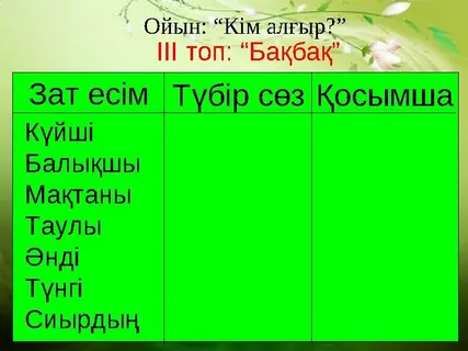 ДескриптоР: Тізбектің басында тұратын сөзді табады-1б Түбір сөздерді қатыстырып сөйлем құрайды-1б Тамаша!