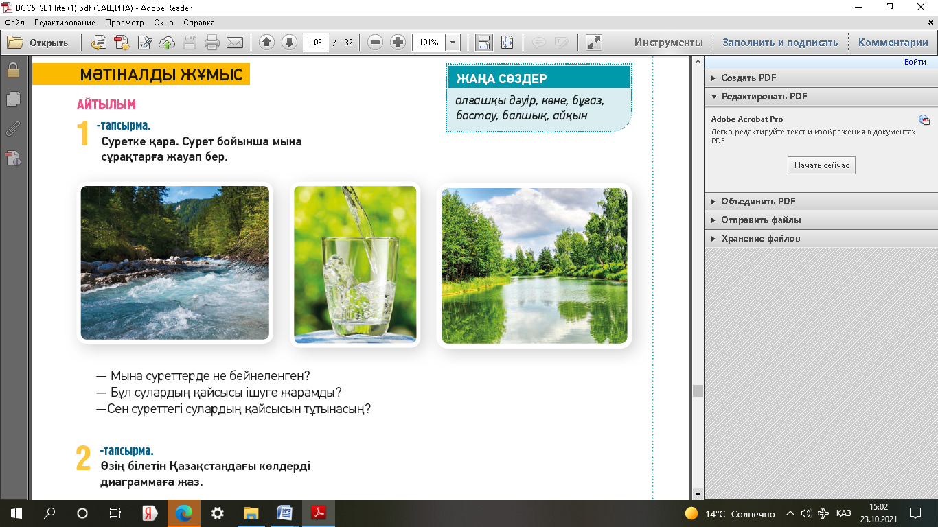1-тапсырма.Айтылым. Суретке қара, сурет бюойынша мына сұрақтарға жауап бер. Мына суреттерде не бейнеленген? Бұл сулардың қайсысы ішуге жарамды? Сен суреттегі сулардың қайсысын тұтынасың? |