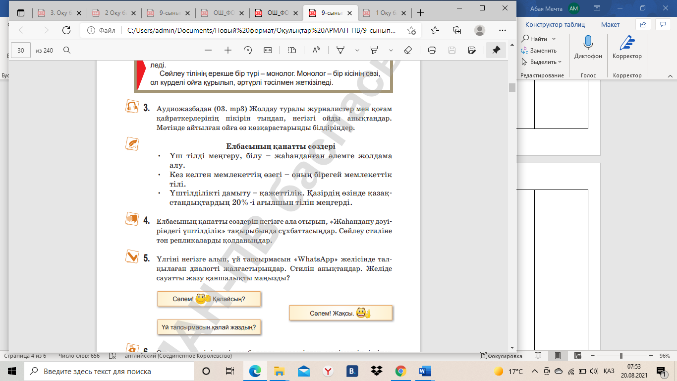 4-тапсырма. Елбасының қанатты сөздерін негізге ала отырып, «Жаһандану дәуіріндегі үштілділік» тақырыбында сұхбаттасыңдар. Сөйлеу стиліне тән репликаларды қолданыңдар.