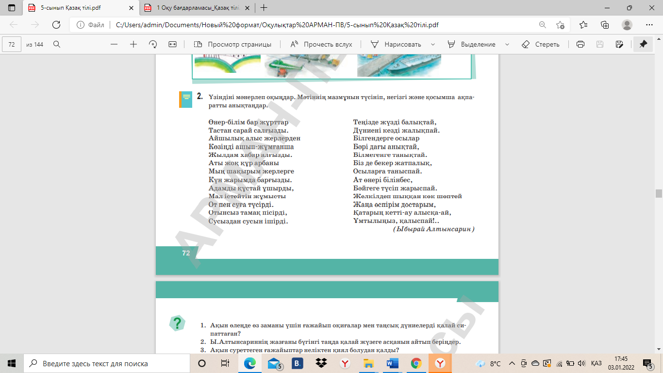 Ыбырай Алтынсарин 5-сынып қазақ тілі оқулығы. https://www.youtube.com/watch?v=Bhw_Jia79ZA |