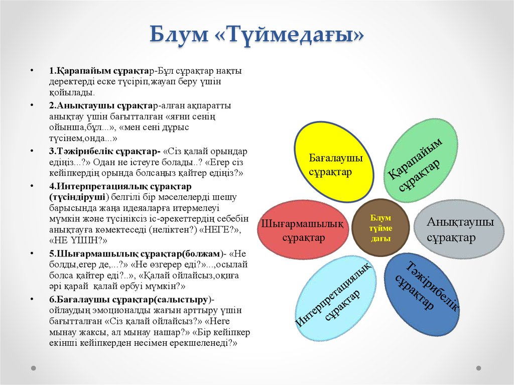 Мәтінді оқып, оқушылар ой тұжырымдайды. Мәтін негізінде «Блум түймедағы» әдісімен оқушылар екі топқа бөлініп, бір-біріне маңызды бір сұрақ дайындайды. Әр сұрақтың түрінен бір-бір сұрақ қойылады. Грамматикалық тақырыпты меңгереді. Грамматикалық тапсырмалар орындайды. «Аяқталмаған сөйлем» әдісімен тақырыпты қорытындылайды. |
