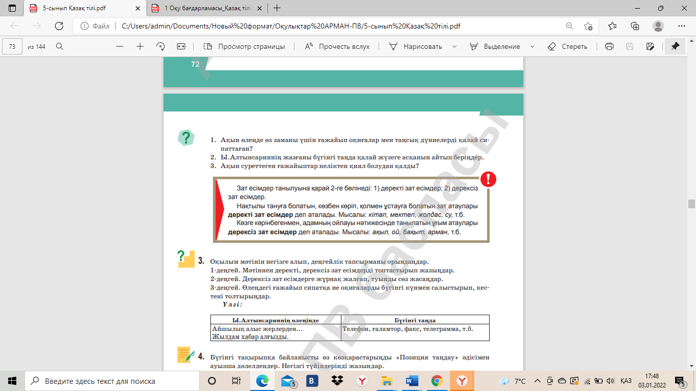 3-тапсырма. Оқылым мәтінін негізге алып, деңгейлік тапсырманы орындаңдар. 1-деңгей. Мәтіннен деректі, дерексіз зат есімдерді топтастырып жазыңдар. 2-деңгей. Дерексіз зат есімдерге жұрнақ жалғап, туынды сөз жасаңдар. 3-деңгей. Өлеңдегі ғажайып сипатқа ие оқиғаларды бүгінгі күнмен салыстырып, кестені толтырыңдар.