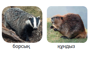 Мәтінді тыңдап, түсінгендеріңді айтады. Суретті пайдаланып, борсық пен құндыздың ұқсастығы мен айырмашылығын нақтылайды. Суреттерге қарап, сұрақ құрастырады. Диалог құрайды. Жақшада берілген үш нұсқаның ішінен дұрысын таңдап, жазады. Сұрақтарға жауап береді. |