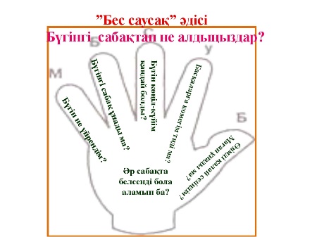 Балалар қағазға өздерінің қолының контурын сызып шығып, әр саусағына сабақ бойынша алған әсерлерін жазады