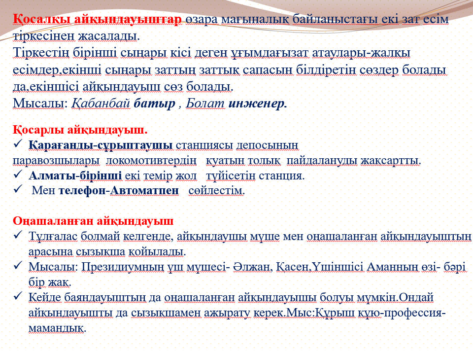 Айтылым 2-тапсырма, 129-бет. Берілген сөйлемдерде оңашаланған айқындауыш бар ма? Бар болса, қандай сөйлем мүшесін айқындап тұрғанын анықтаңдар. Жазылым 3-тапсырма, 129-бет. Оңашаланған айқындауыштары бар сөйлемдерді бір бөлек, қосалқы, қосарлы айқындауышы бар сөйлемдерді бір бөлек көшіріп жазыңдар. |