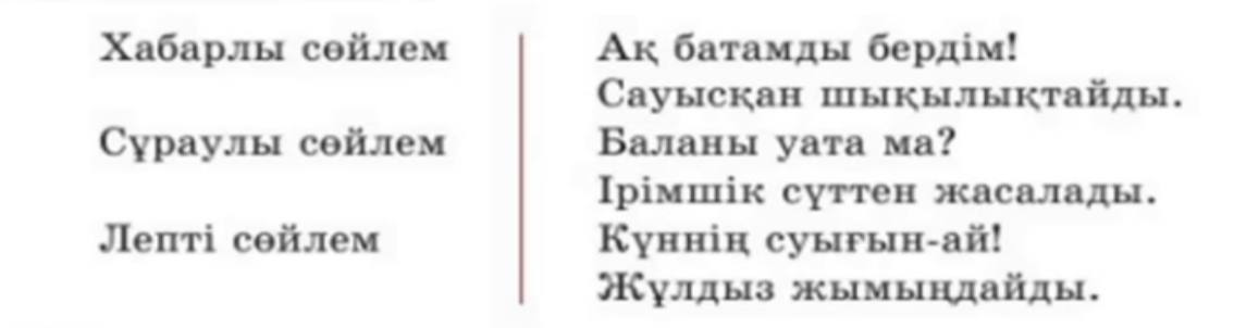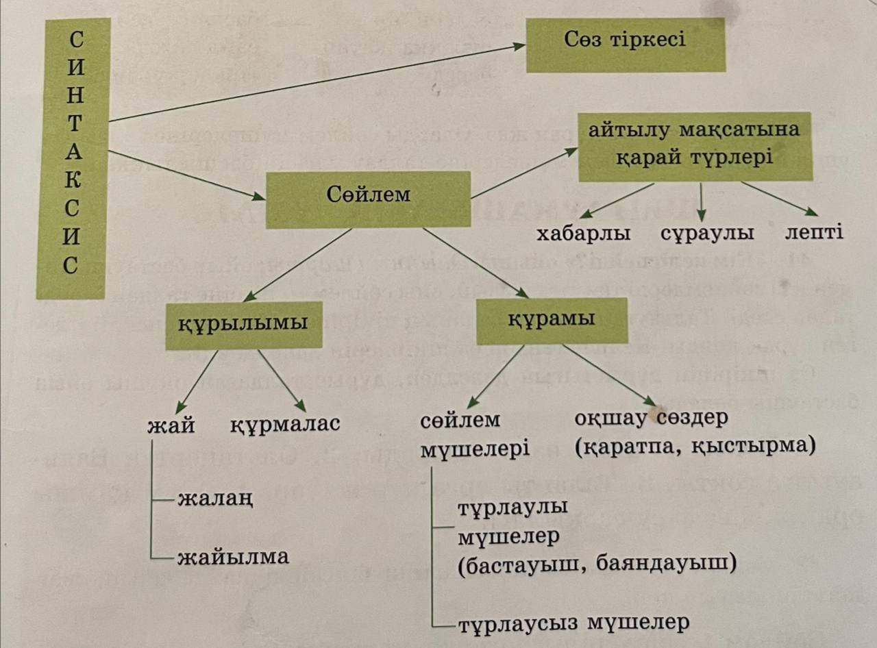 - Сызбадағы синтаксистің қай тақырыптары саған таныс ? - Қай тақырыптар таныс емес ?өз ойыңды ортаға сал. 3-тапсырма -Жай сөйлемдерді сөйлемнің айтылу мақсатына қарай бөлінетін түрлерімен сәйкестендір