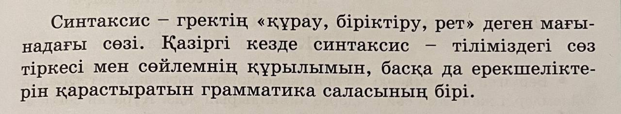 Амандасу -Сәлеметсіңдер ме,оқушылар! Бүгінгі сабақтарыңа сәттілік тілеймін. Өткен тақырыпқа шолу: -Үй тапсырмасын сұрау. -Бір-біріңе өткен тақырыпқа байланысты сұрақтар қойып, жауап алыңдар. Жаңа оқу материалын жариялау «Миға шабуыл» әдісі: -Синтаксис деген не білесіңдер ме ? Оқушылар біз бүгін синтаксис сөзіне толық анықтама береміз. Тақырып: Синтексис әлеміне саяхат. Синтаксис-гректің «құрау, біріктіру, рет» деген мағынадағы сөзі. Ал енді Али мен Мерейдің арасындағы диалогты оқып көрикші.