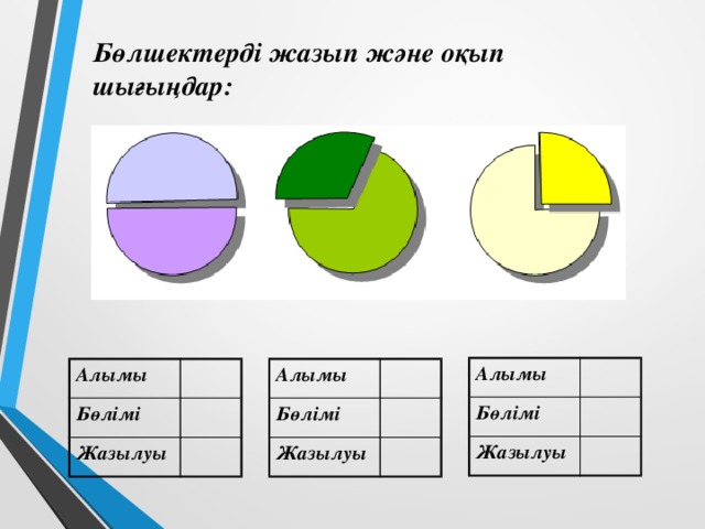 3.1.1.5 үлесті құру жолын көрсетіп беру, оларды оқу, жазу және салыстыру 3.1.1.6 жай бөлшектерді оқып, жазу; көрнекіліктерді пайдалана отырып, бірдей мәнділігі бар бөлшектерді салыстыру |
