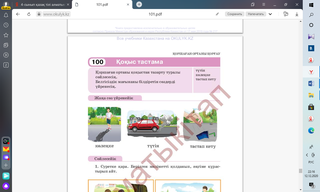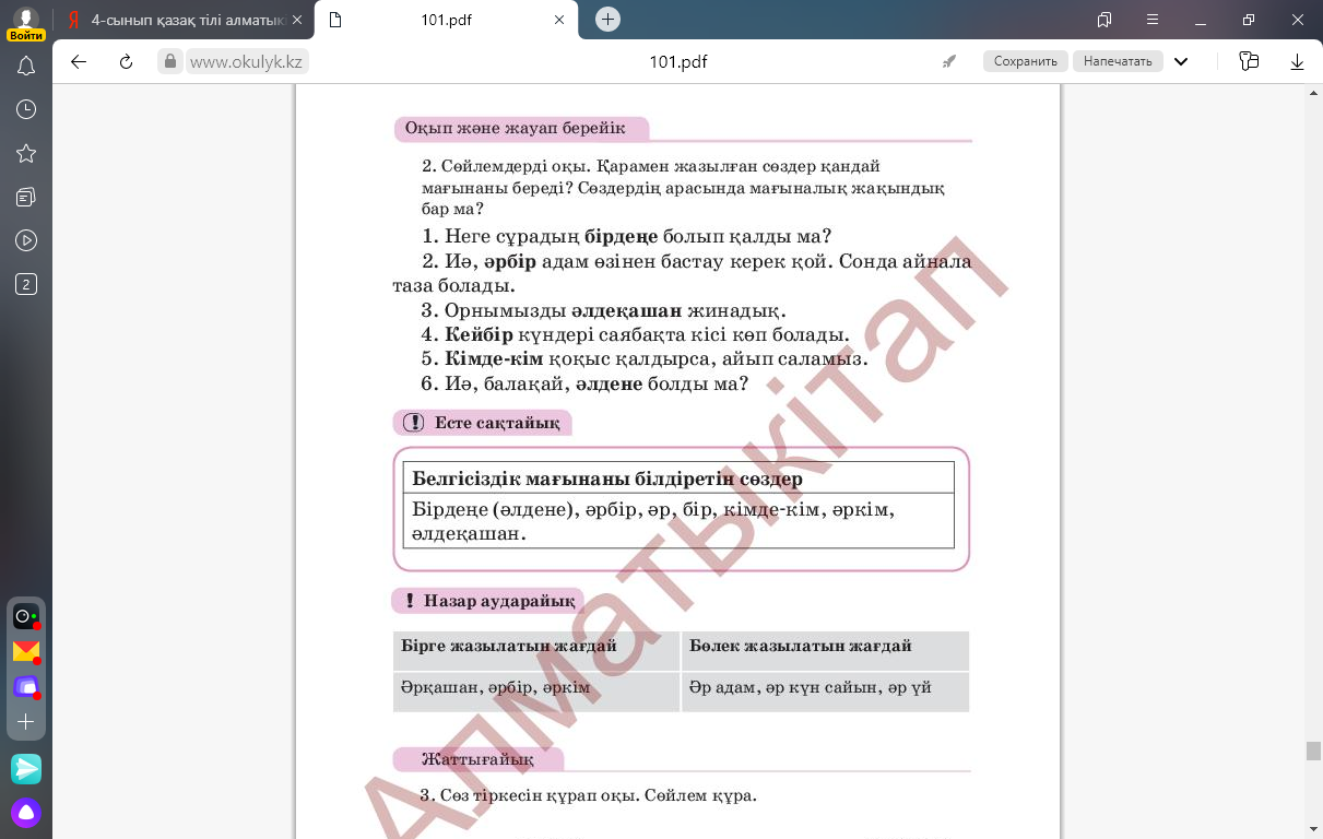 3. Айтылым. Ойланайық. 2-тапсырма Сөйлемдерді оқы. Қарамен жазылған сөздер қандай мағынаны береді? Сөздердің арасында мағыналық жақындық бар ма? Неге сұрадың бірдеңе болып қалды ма? Иә, әрбір адам өзінен бастау керек қой. Сонда айнала таза болады. Орнымызды әлдеқашан жинадық. Кейбір күндері саябақта кісі көп болады. Кімде-кім қоқыс қалдырса, айып саламыз. Иә,, балақай, әлдене болды ма? |