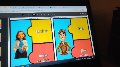 - In pairs, decide who will be the runner and who will be the writer. - The runner goes to the text, reads a part, memorizes it, and comes back to dictate it. - The writer listens and writes down the sentence. - Switch roles if needed and continue until the full text is completed. - Compare and correct their version with the original text. Analyzes the two parts of the puzzle: the profession name (e.g., Pilot) and the action (e.g., flies planes).Matches the correct action to the corresponding profession, verbally or by drawing a line/pointing. - Work with their partner. - Take turns reading the sentences aloud. - Guess and write the correct job in the blank (e.g., doctor, pilot, student, actor). - Say the full sentence to each other for speaking practice. - Check answers together with the teacher at the end. - Check answers together – Look at the AI slides - Repeat the word or phrase with the same facial expression and feeling. - Practice with different emotions (e.g., surprised, tired, excited). - Participate in a fun