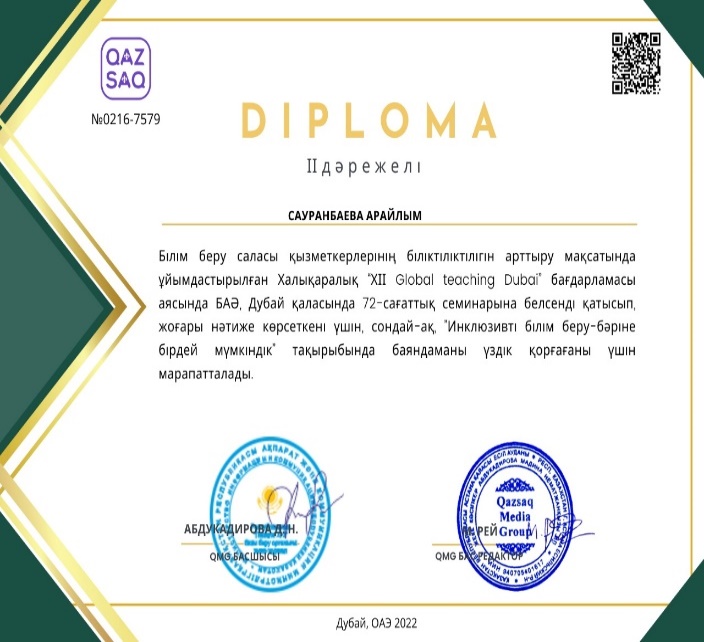 - 2022 жылдың желтоқсан айының 19-22 күндері аралығында БАӘ, Дубай қаласына халықаралық ғылыми-тәжірибелік педагогикалық «12 Global teaching Dubai» семинарына мектептің тәжірибелі ұстаздары: бастауыш сынып мұғалімі, қосымша тартылған НЗМ ПШО тренері А.Б.Сауранбаева белсенді қатысып, жоғары нәтиже көрсеткені үшін және «Инклюзивті білім беру – бәріне бірдей мүмкіндік» тақырыбында шебер сынып көрсетіп, тәжірибе алмасқаны үшін ІІ дәрежелі дипломмен, арнайы төс белгімен марапатталды; Ибраева Турсынхан Жанаткановна, директордың оқу-тәрбие ісі жөніндегі орынбасары «Сабақты зерттеу-кәсіби дамудың құралы» тақырыбындағы шебер сабағы І дәрежелі дипломмен, «Үздік ұстаз» төсбелгісімен марапатталды.