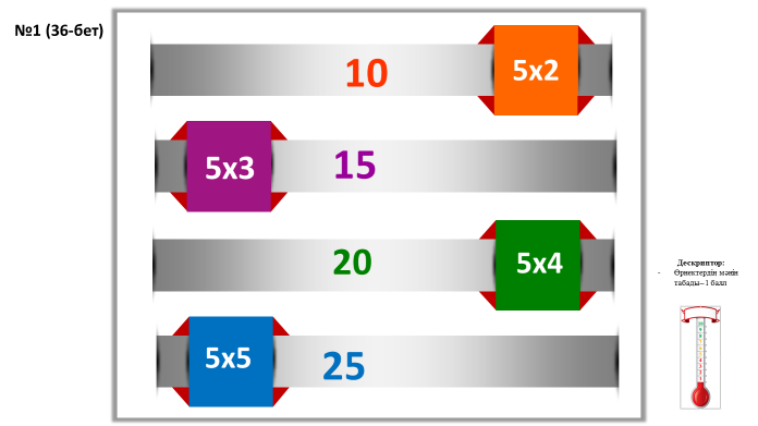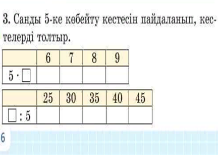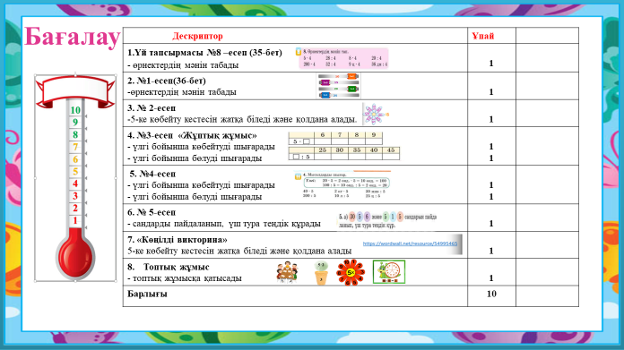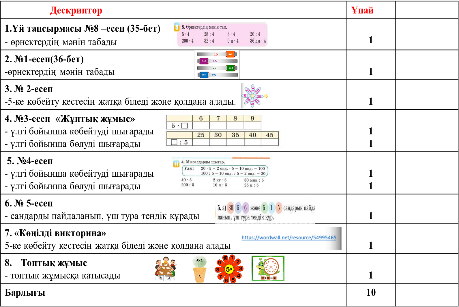 Дескриптор: -өрнектердің мәнін айады-1 балл Дескриптор: -5-ке көбейту кестесін жатқа айтады және қолдана алады– 1 балл Дескриптор: -көбейту кестесін толтырады – 1 балл бөлу кестесін толтырады – 1 балл
