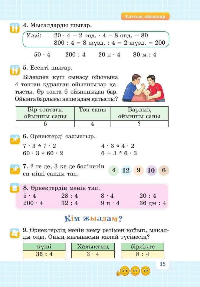 Санды 5-ке көбейту кестесін пайдаланып, кестелерді толтыр. 5 * 6 = 30 25 : 5 = 5 5 * 7 = 35 30 : 5 = 6 5 * 8 = 40 35 : 5 = 7 5 * 9 = 45 40 : 5 = 8 «Нейрожаттығу» Әртүрлі саусақпен жасалған қимыл –қозғалысты бейнелейтін суреттерді кезек – кезек көрсету. 4-тапсырма Дәптермен жұмыс ЕҚБ Үлгіге қарап, мысалдарды шығар. 40 * 5 = 4 онд. * 5= 2 жүзд.= 200 200 : 5= 2 жүзд. : 5 = 4 онд. =40 2 кг * 5 = 2бірл.кг * 5= 1онд.кг = 10кг 10л : 5 = 1 онд.л : 5 = 2бірл.л = 2л. 30 мин : 5 = 3онд. : 5 = 6 бірл.мин = 6 мин. 25 ц : 5 = 2онд.5бірл.: 5 = 5бірл. ц = 5 ц