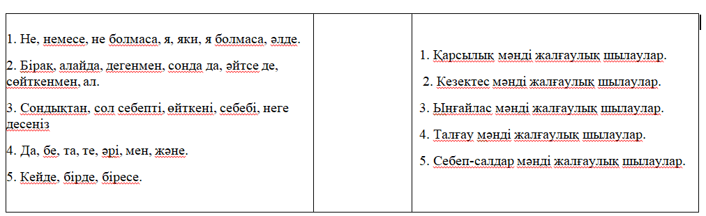 1) Ыңғайлас мәнді жалғаулық шылаулар: да, де, та, те, әрі, мен, және, әрі.