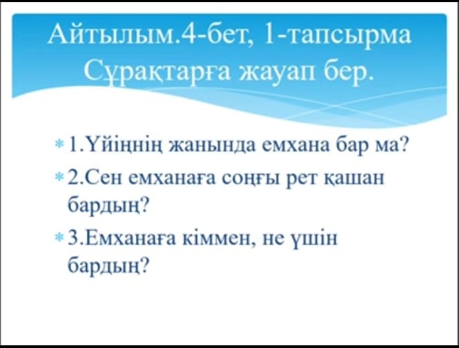 1)Жұмбақтың шешімін айтады: Емхана 2) Сұрақтарға жауап береді. -Иә, үйімнің жанында емхана бар. -Мен емханаға өткен аптада бардым. -Емханаға анаммен бардым. Тіс дәрігеріне көріндім. |