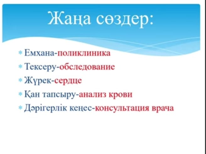 2.Жаңа сөздердің мағынасын түсінеді. Емхана-поликлиника Тексеру-осмотр Жүрек-сердце Қан тапсыру-сдать кровь Дәрігерлік кеңес-консультация врача 3.Жаңа сөздермен сөйлемдер құрайды. Ынтасы төмен оқушылар сөз тіркестерін құрайды. |