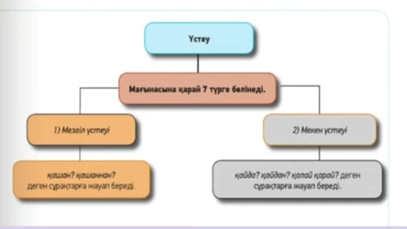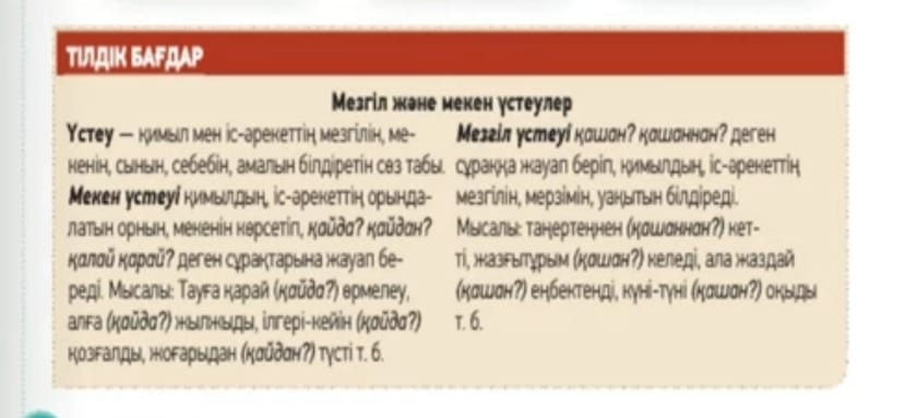 5.1.6.1. Тыңдалым материалдарының мазмұны негізінде сұрақтарға жауап беру 5.5.1.6. Мекен және мезгіл үстеулерді ауызша және жазба жұмыстарда орынды қолдану. |