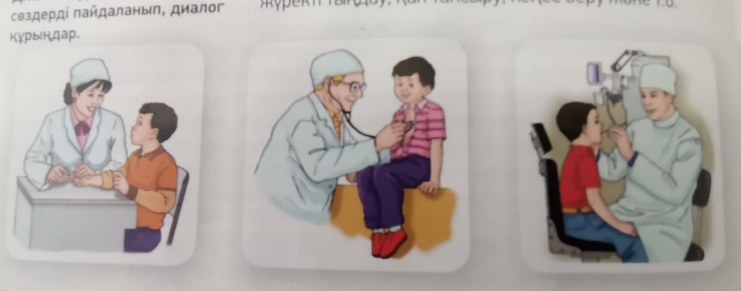 1)Жұптық жұмыс. Рөлдік ойын. «Дәрігердің қабылдауында.» Бірің-дәрігер, бірің-емделуші болып диалог құрыңдар. Диалогте мезгіл мен мекен үстеулерін қолданыңдар. |