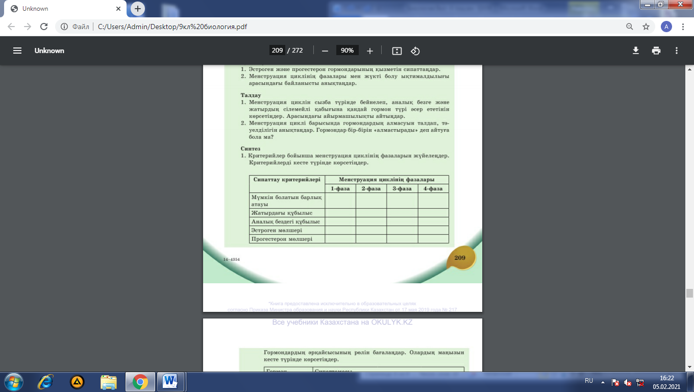 Барлық оқушылар үшін: Білім алушылар салыстыра алады. Менструалдық цикідді біледі және фазаларын ажырата алады. |