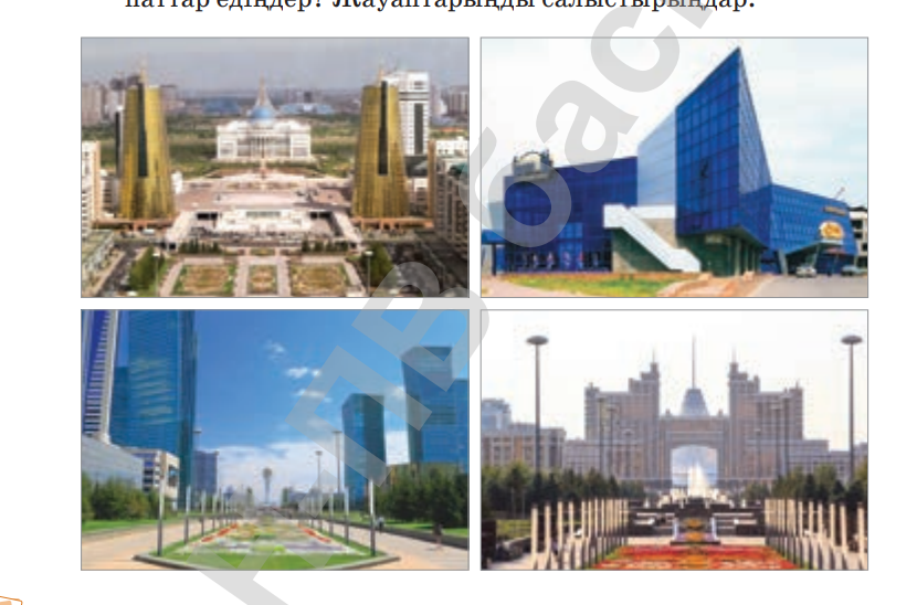 (Ұ) «Миға шабуыл» әдісі арқылы өткен тақырыппен жаңа сабақты байланыстыру мақсатында ой қозғау сұрақтарын ұжымдық талқылау. Сұрақтар: 1.Елорда тарихы мен қалып та су кезеңдері туралы қан дай ақпарат білесіңдер? 2. Суреттердегі астанамыз дың келбетін 5 сөзбен қалай сипаттар едіңдер? |