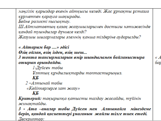 10.1.5.1 - шығармадағы ұлттық құндылықтардың әлемдік тақырыптармен үндестігін ашу |
