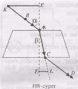 А нүктесінен бастап АС және АВ кесінділеріне 5 сантиметрден өлшеп салып, К және L нүктелерін алыңдар. Осы нүктелерден ЕҒ-ке перпеңдикуляр тусіріңдер. Алынған тік бұрышты АЕК мен АҒL ұшбурыштарында: <ЕАК=а (тусу бурышы), <ҒАL=β (сыну бурышы).