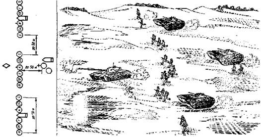 Дескриптор -«Бөлімше,... (бағытталған заттың атауы) бағытына –Ұрысқа» командасы бойынша сарбаздар аралығы 6-8м болатын тізбекке дұрыс жазылады. -«Тоқта», «Қысқа жүгіріспен – Алға», «Жербауырлап – Алға», «Газдар», «Газтұмылдырықты ШЕШ», «Әуе шабуылы», «Әуе шабуылы тоқтады» командалары бойынша дұрыс әрекет етеді. -«Бөлімше, ізімнен, бір (екі) кісілік лекпен, минадан тазартылған өткел бойынша жүгіре – БАС» командасы бойынша оқшашаршы өткелге бірінші ұмтылады, оқ атып бөлімге қолдау көрсетеді. Басқа сарбаздар лекке тұрып, танкінің ізімен жалма-жан алға жүгіріп немесе жасалған өткелмен жаяу әскердің ұрыс машинасының қорғауымен миналанған даладан өтеді. - Сарбаздар тізбекке дұрыс жазылады. - Гранаталарын орға лақтырады және «УРА» деп айғайлап, жалма-жан ұмтылып, қорғаныстың алдыңғы шетіне қарай жүгіреді, қарсыласқа жақындап, оларды атып, жояды, тоқтамастан белгіленген бағытқа қарай шабуылдауды жалғастырады, «Машина маңына», «Орындарыңа» командаларын дұрыс орындайды |