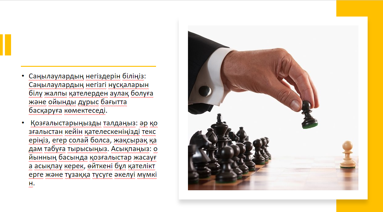 Оқушыларға шахматтағы негізгі қателерді көрсету, бірнеше стратегиялық жүрістерді түсіндіру. Әр белгілі бір қозғалыстардың ойынның нәтижесіне қалай әсер ететінін және неге әсер ететінін түсіндіру.
