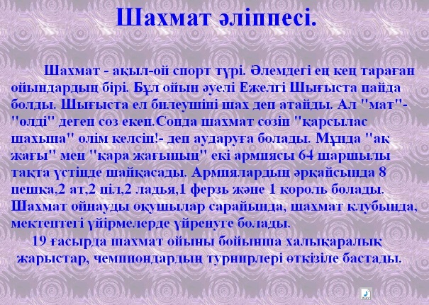Үйге тапсырма беру: Шахматты үйренуге арналған компьютерлік қосымшалар мен бағдарламар жайлы материал жинап кел |