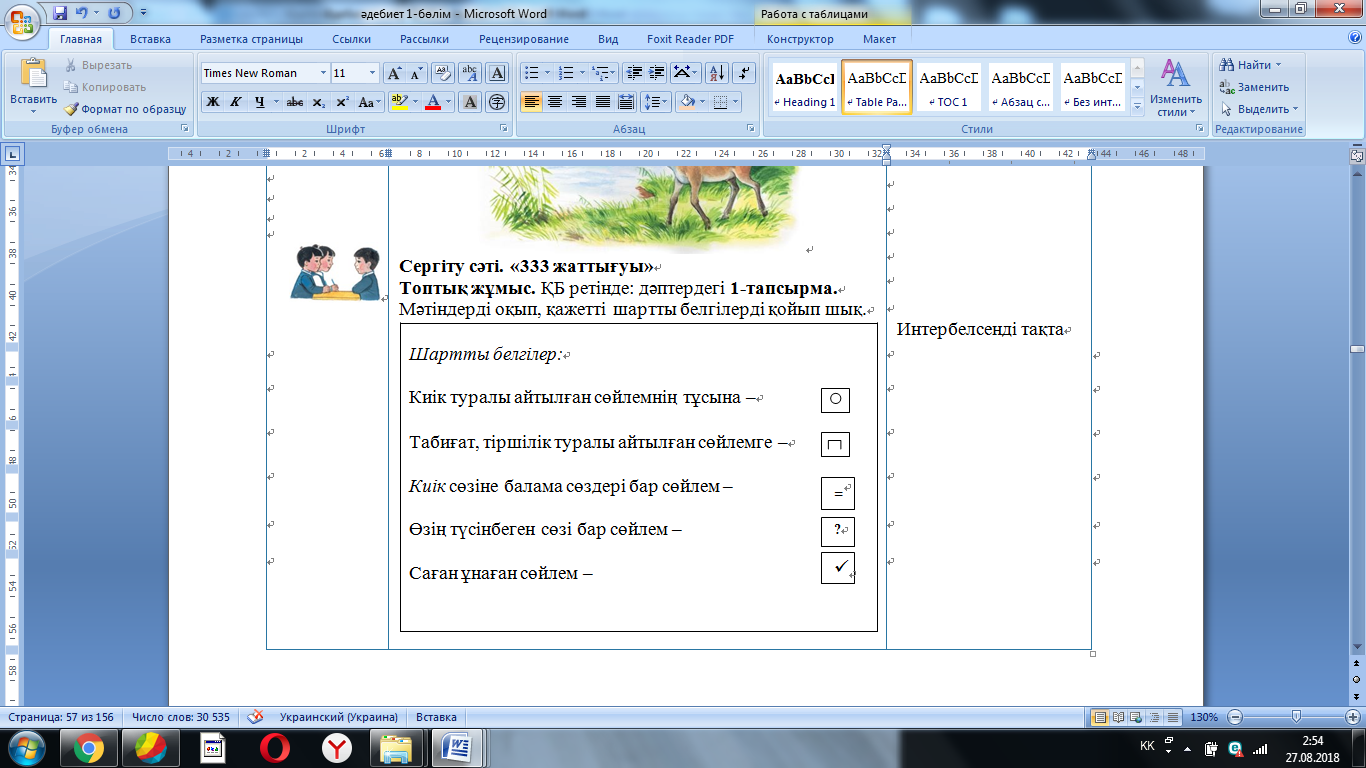 2.1 Оқу түрлерін қолдану. 3.2.1.2 – шығарманы іштей саналы түрде түсініп, көз жүгіртіп, шолып, түртіп алып, қажетті ақпаратты тауып, белгі қойып, сын тұрғысынан бағалап оқу. |