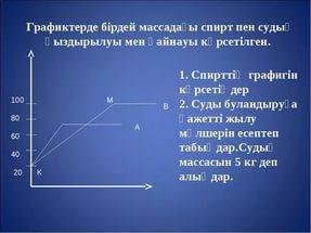 1.Судың қайнау температурасы массаға байланысты ма ? 2.Қайнағаннан кейін судың температурасы өзгереді ме? 3.Температура жоғарылағанда судың молекулаларының кинетикалық энергиясы арта ма, кеми ме ? 4.Су температурасы немен өлшенеді ? 5.Табиғатта су қандай күйде кездеседі ? 6. Су заттың қандай күйіне жатады ? |