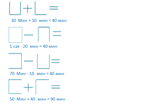 Шығарып көр. Маржан үй тапсырмасын бір сағатта орындайды. Ал Айжан үй тапсырмасына 10 минут кем жұмсайды.Қыздардың әрқайсысы үй тапсырмасын неше минутта орындады. Сен қалай білдің? Маржан- 60 мин Айжан-?, 10мин кем Ш:60-10= 50(мин) Ж: Маржан 60 мин, Айжан 50мин орындады Қайсысы тез және қанша уақыт тез орындады? Дәптермен жұмыс Сергіту сәті Әуенге сай қимыл жасайды. «Өрнекте» Дескриптор Сағатпен және минутпен өрнектеп жаз.
