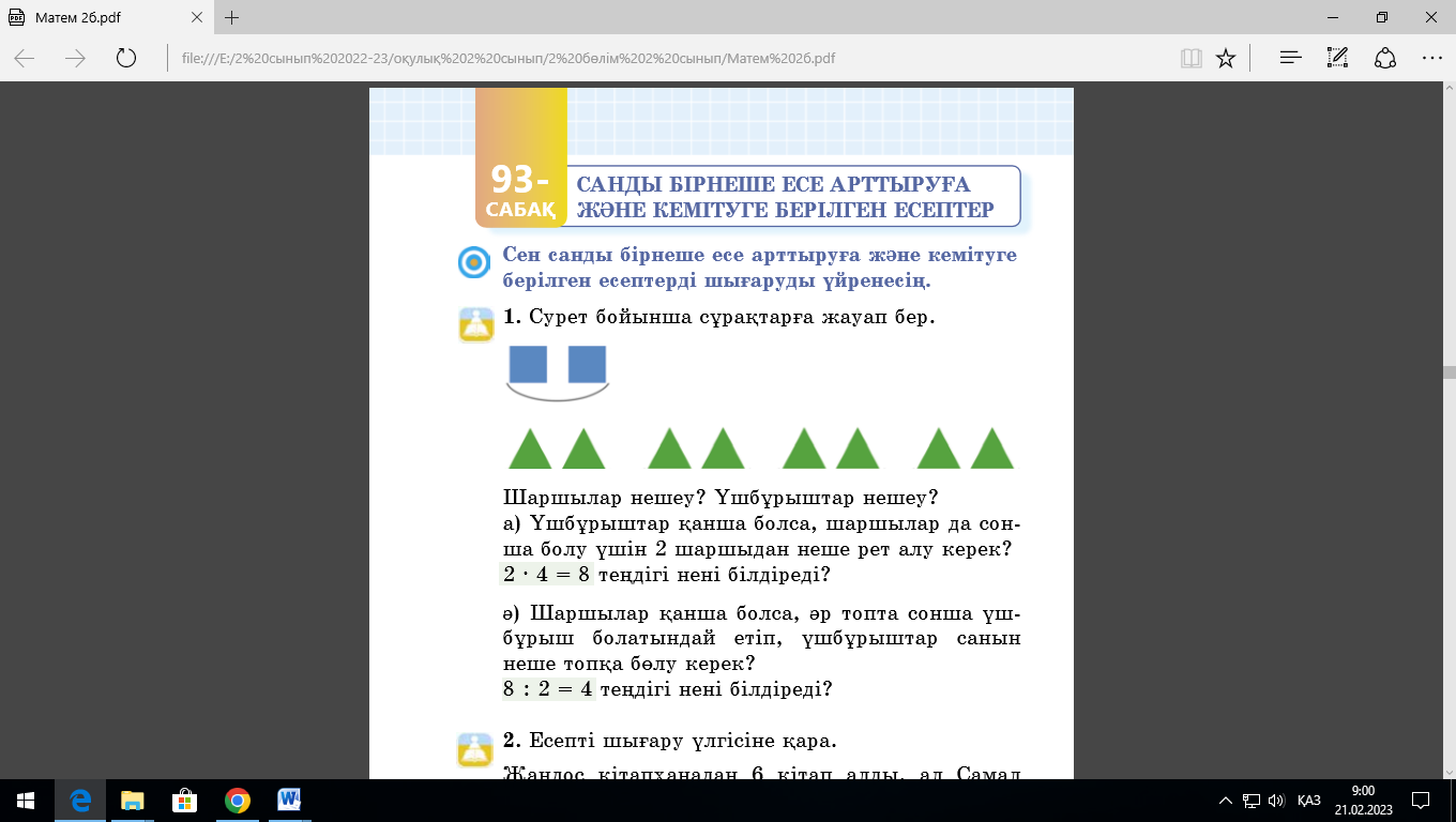 №93 сабақ. Санды бірнеше есе арттыруға және кемітуге берілген есептер |