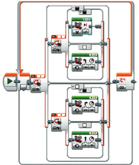 3 - тапсырма Бір түс және екі түс датчигі бар роботтардың программаларын салыстырыңдар. Салыстыру барысында жылдамдығын, жүріп өту дәлдігін анықтаңдар. Қай программаны жарыста қолданған тиімді? |