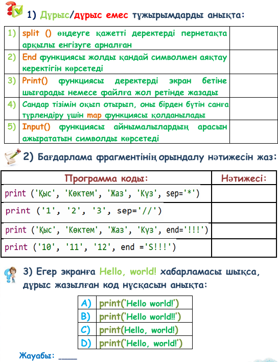 Топтарға бөлінеді, тапсырманы топта орындайды Дескрипторлар: - дұрыс/ дұрыс емес жауапты анықтайды - кестені толтырады - бағдарлама кодын таңдайды; Көз жаттығуларын орындайды - иә/ жоқ жауапты анықтайды - интерактивті тапсырманы орындайды; - бағдарламаны толықтырып жазады, нәтижесіне талдау жасайды |