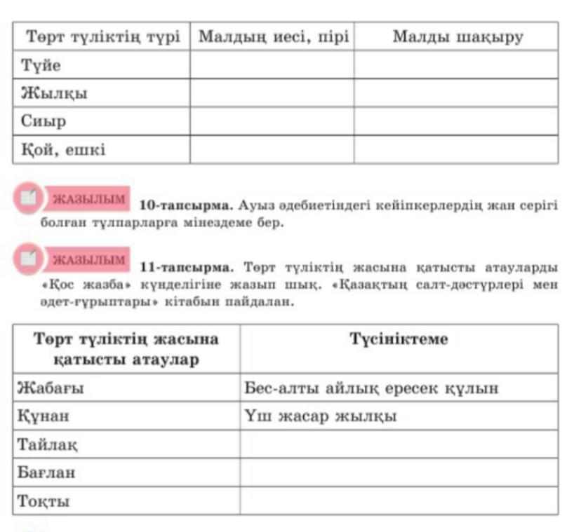 2 тапсырма Төрт түліктің жасына қатысты атауларды «қос жазба» күнделігіне жазып шық.