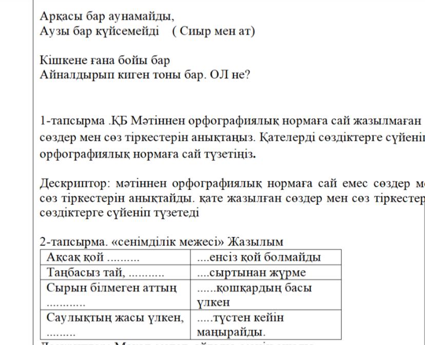 Тапсырманы орындайды Сөздердің көп мағыналы және омонимдік тіркесін құрап жазады Мұғаліммен бірге саусақ қимыл қозғалыс жасайды Жұмбақтарды шешеді