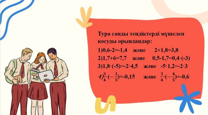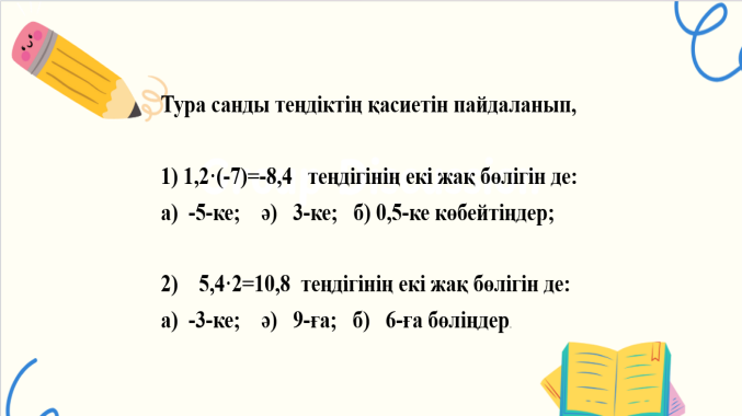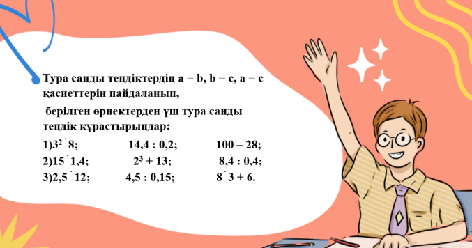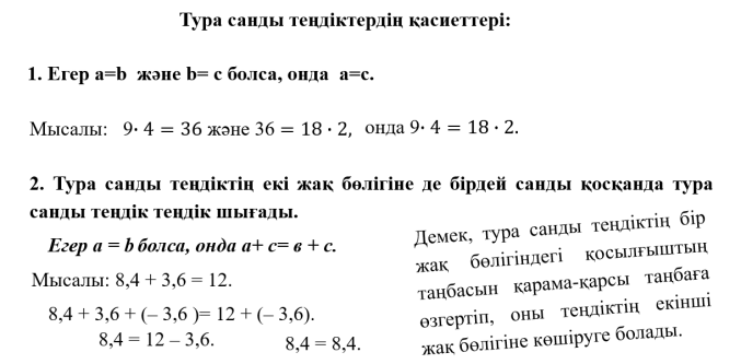 тура санды теңдіктердің қасиеттерін есеп шығаруда қолданады. |