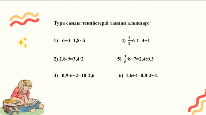 Дескриптор: Тура саңды теңдіктерді табады .2 балл Дескриптор: Бөлігі бойынша санды табады 2 балл Дескриптор: Теңдіктін екі жақ бөлігін де берілген сандарға көбейтеді Теңдіктін екі жақ бөлігін де берілген сандарға бөледі 2 балл Дескриптор: Тура саңды теңдіктерді мүшелеп қосады 2 балл Дескриптор: Тура саңды теңдіктерді құрастырады 2 балл Оқулықпен жұмыс 2 балл |