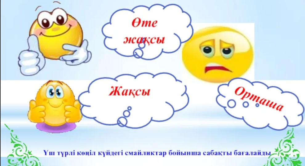 Оқушылар үш түрлі күйдегі смайликтер арқылы сабақты түсінгенін, түсінбегенін көрсетеді. |